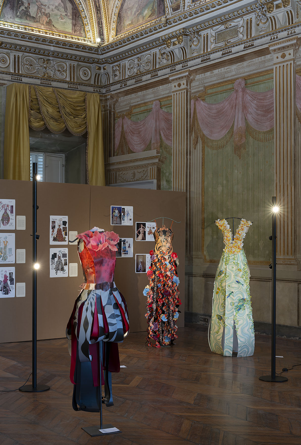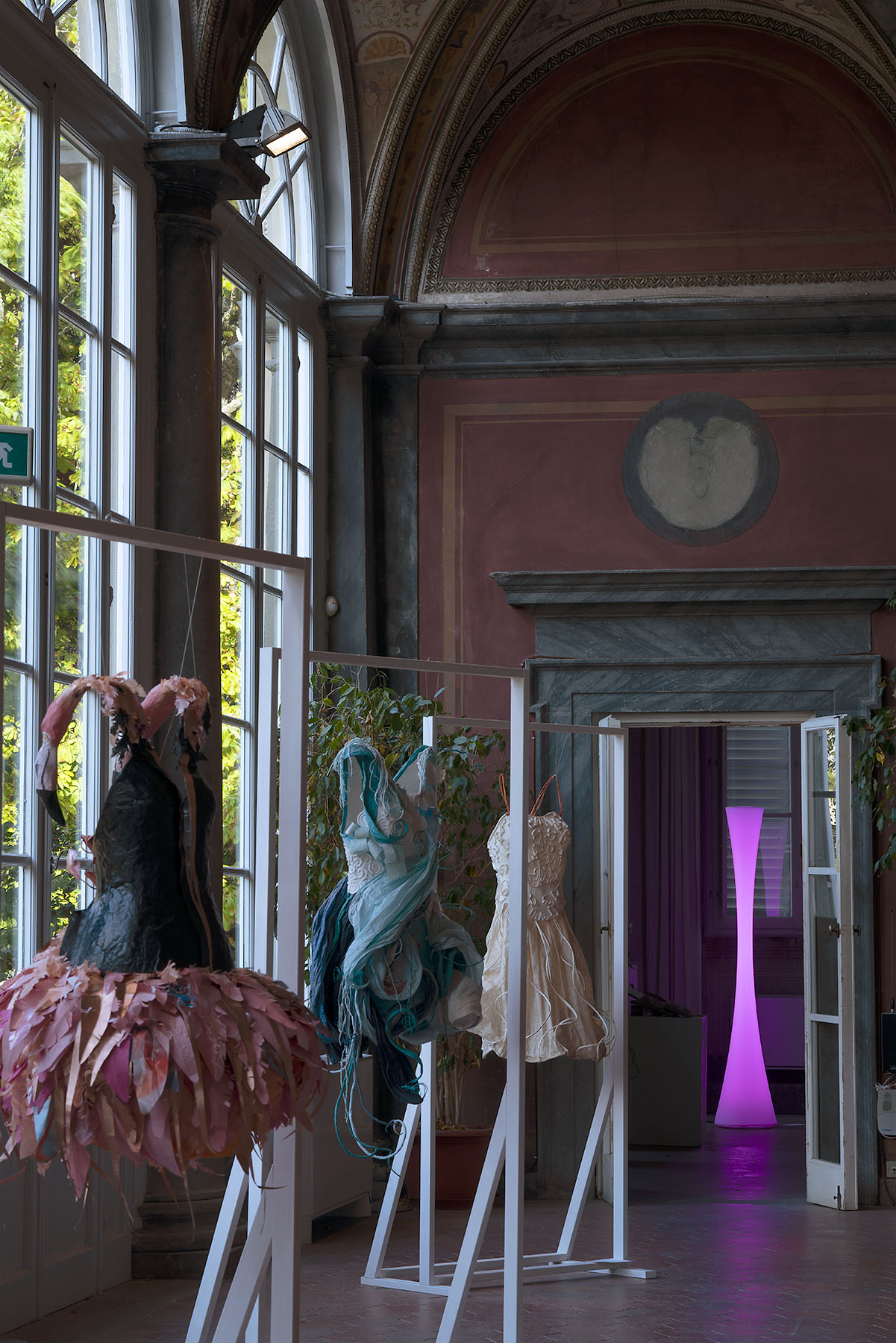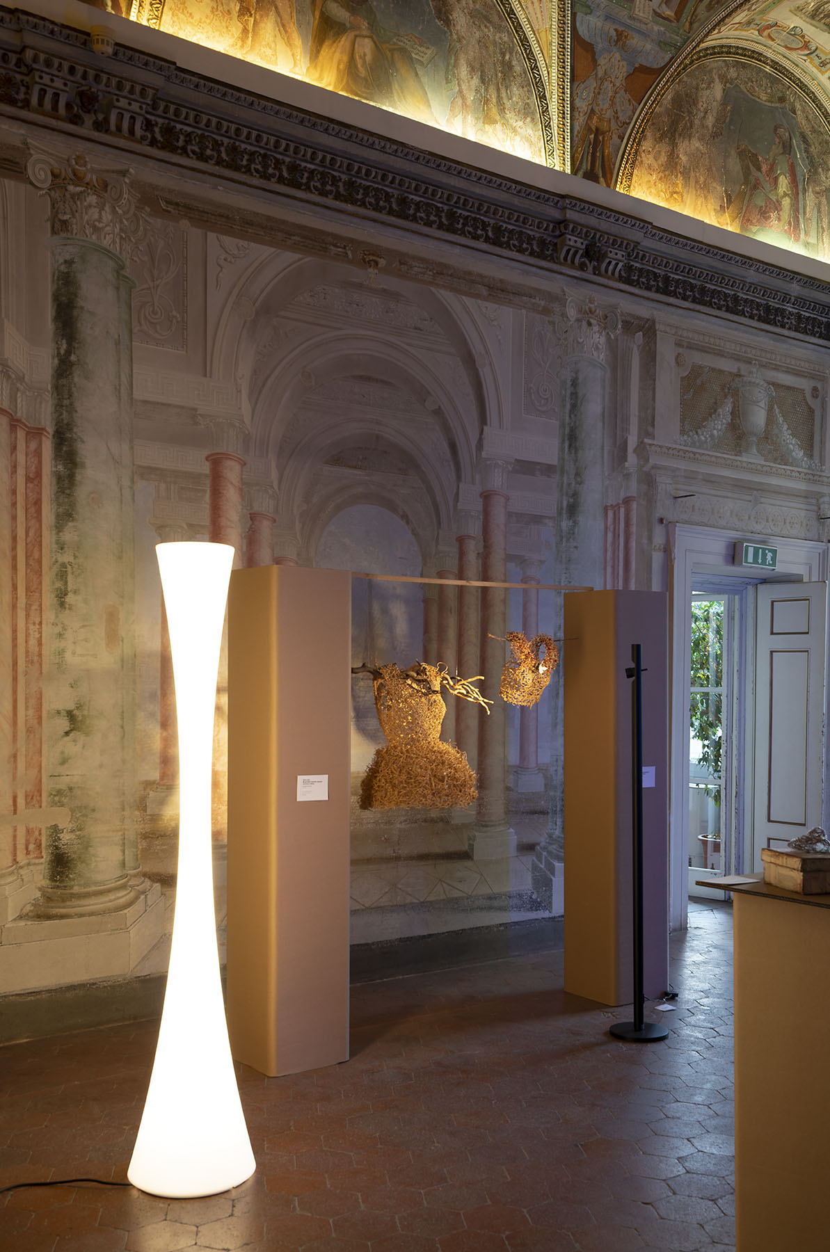 At Villa Bottini there is an exhibition dedicated to fashion, paper clothes and jewelry treated as a textile structure. Real wearable works of art. Here in particular, our lamps help to spark interest in this topic.