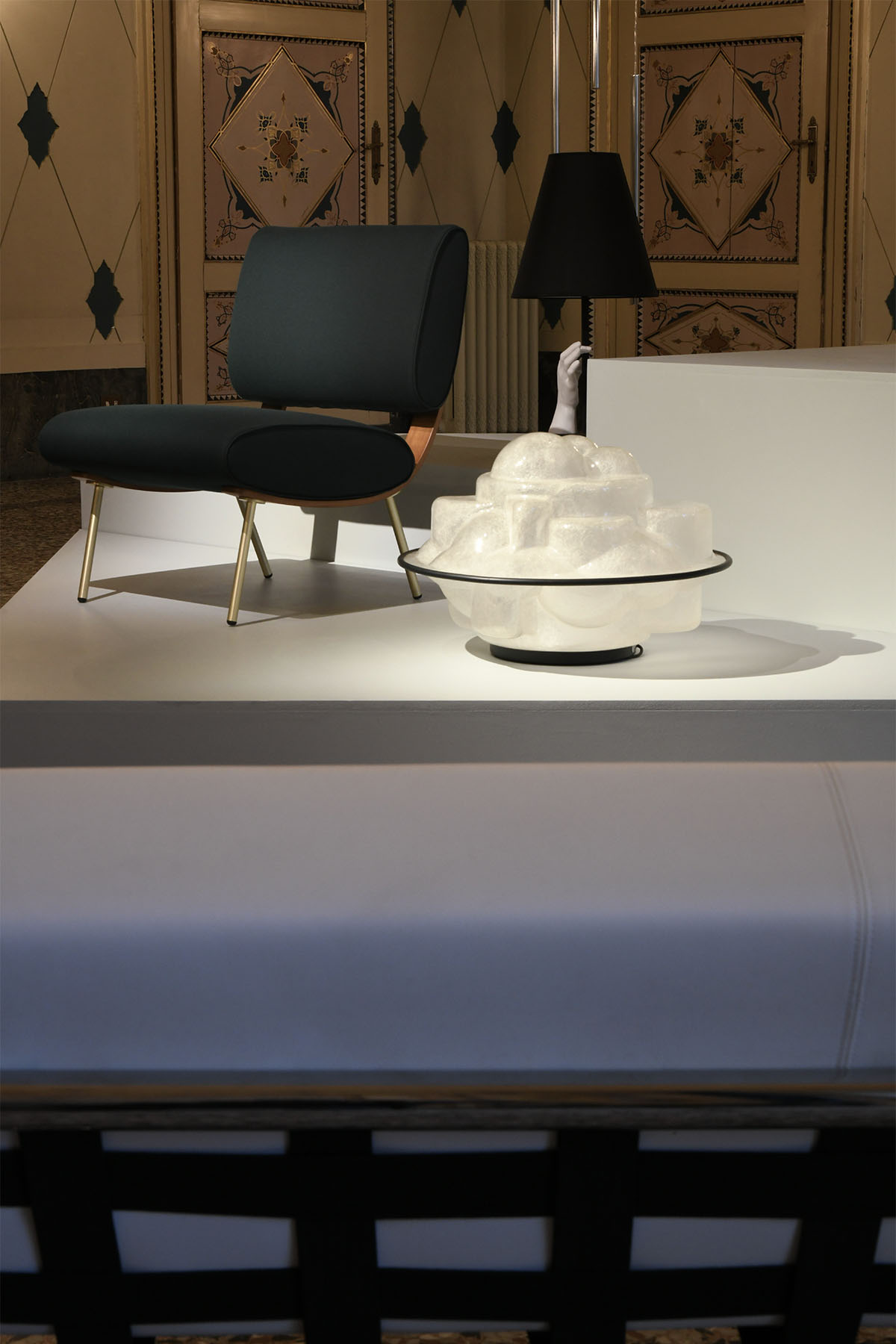 Martinelli Luce will be present with the Profiterolle lamp designed by Sergio Asti (1968), an iconic product inspired by the famous dessert and composed of two methacrylate and polyester shells with fibreglass, characterised by an elegant combination of solids and circles, which continuously embrace and chase each other.