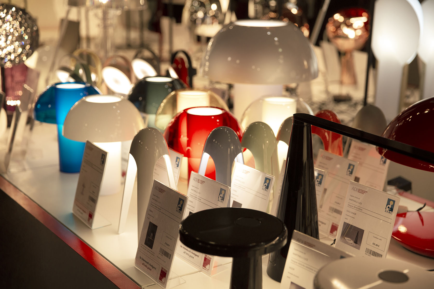 Martinelli Luce has made available its most representative lamps to finance research against cancer: visitors could admire and buy design icons such as the p ipistrello and cobra, pieces awarded the Compasso d'Oro as the elica and other lamps such as cyborg, hoop, ciuli fruli and many others.