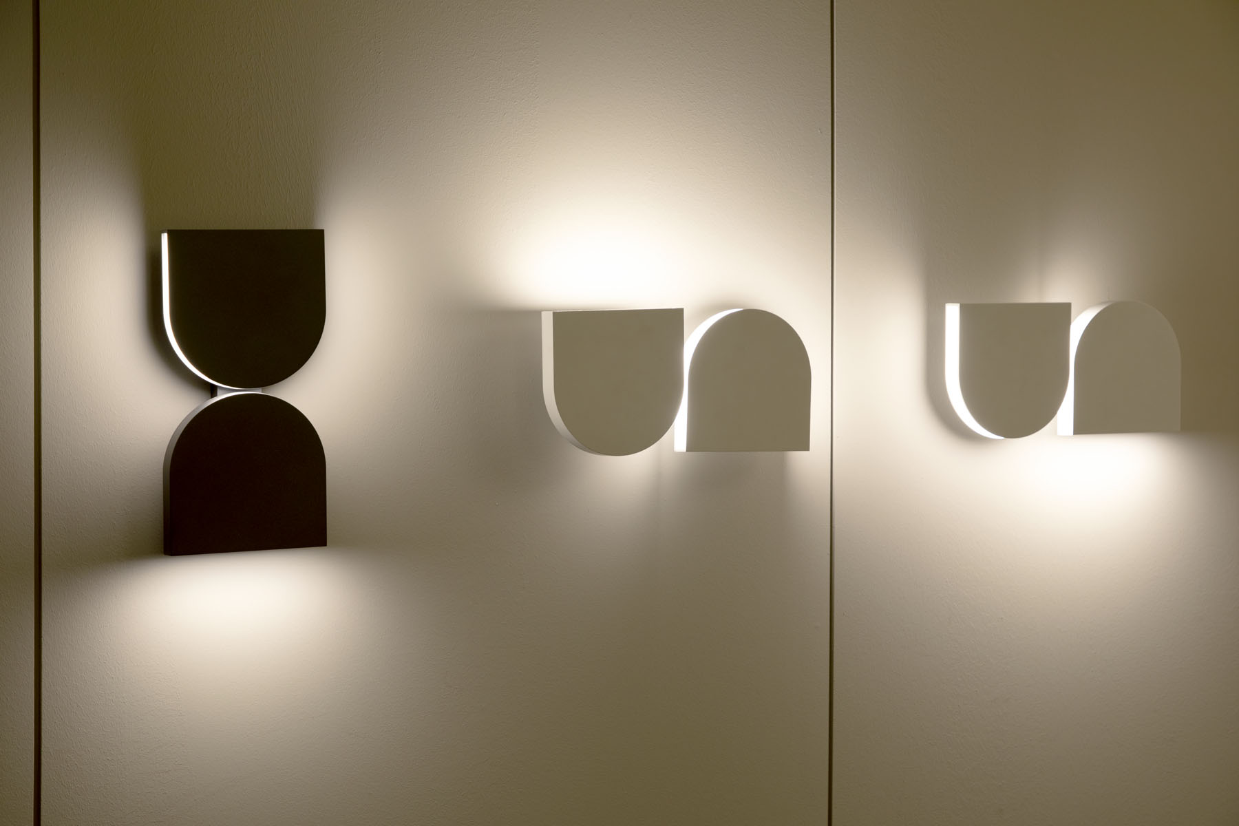 DUD de ZPSTUDIO - Eva Parigi et Matteo Zetti : une lampe murale dont la silhouette rappelle les caractères typographiques D et U qui tournent indépendamment sur une base commune.