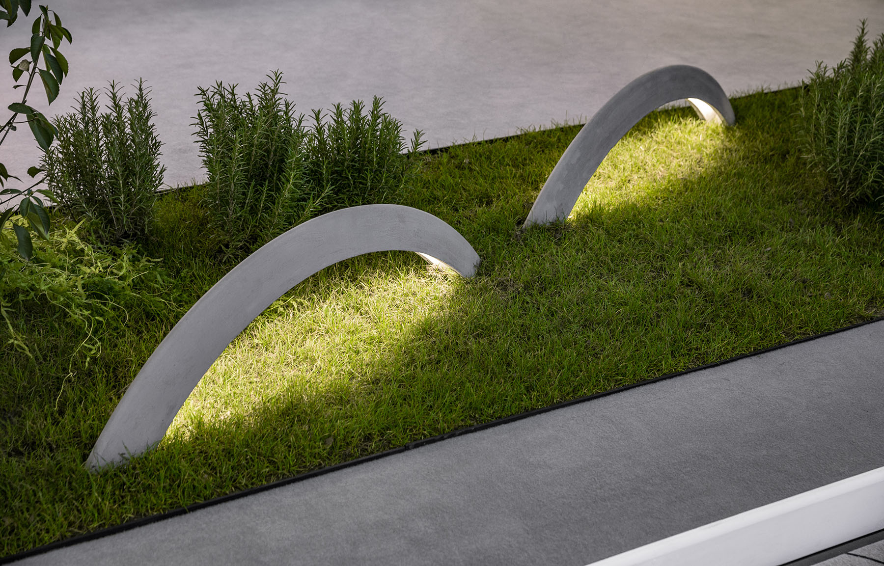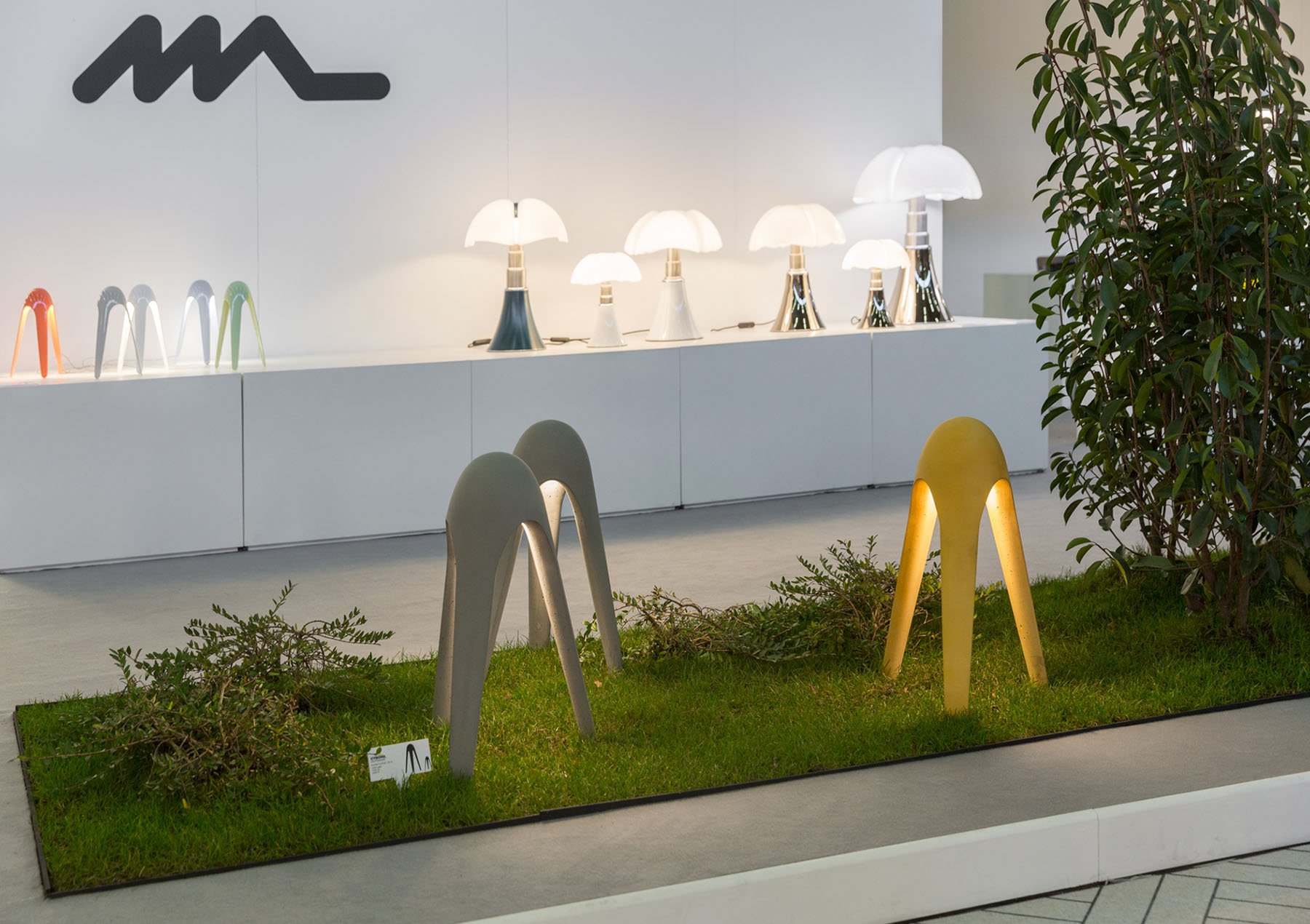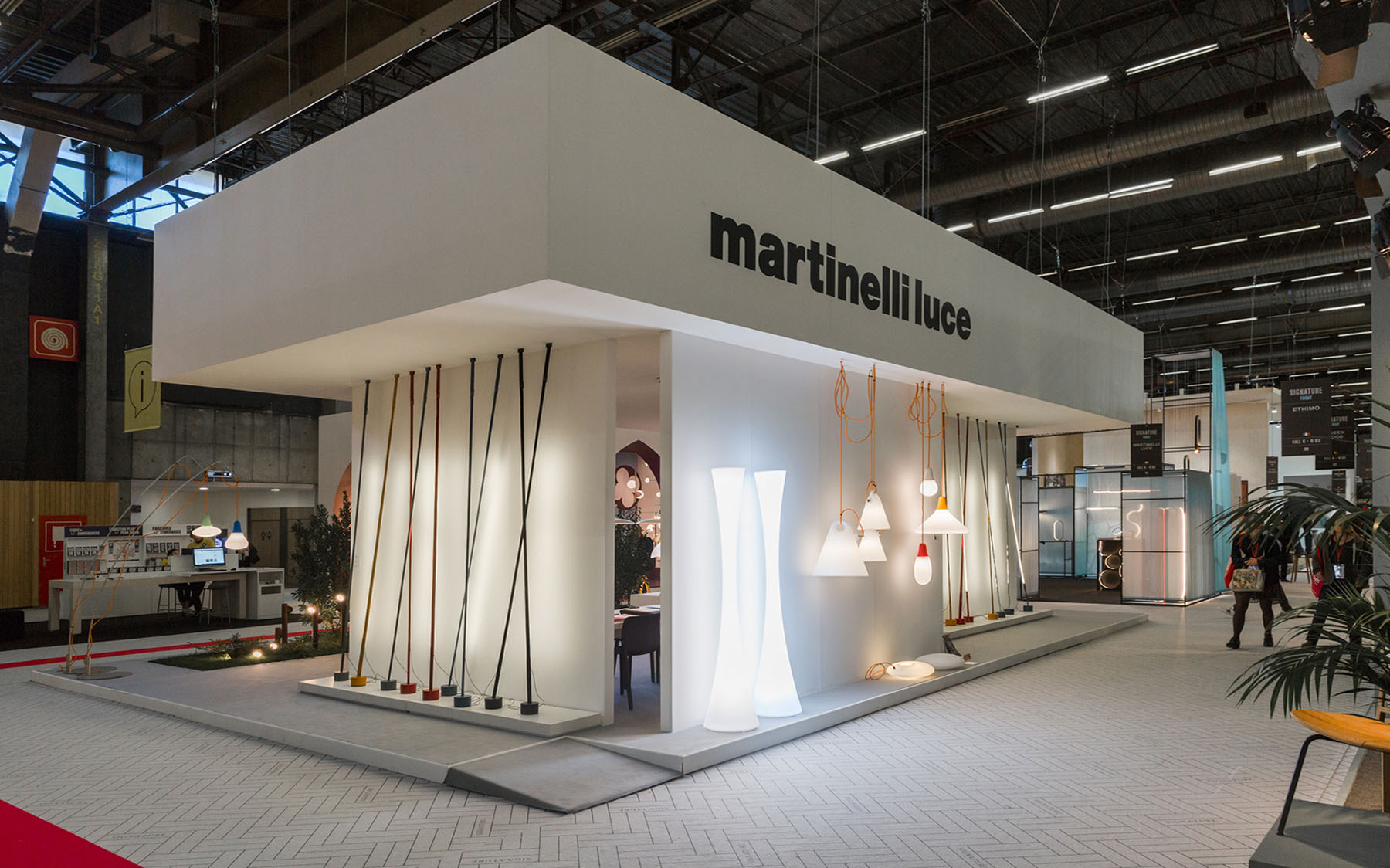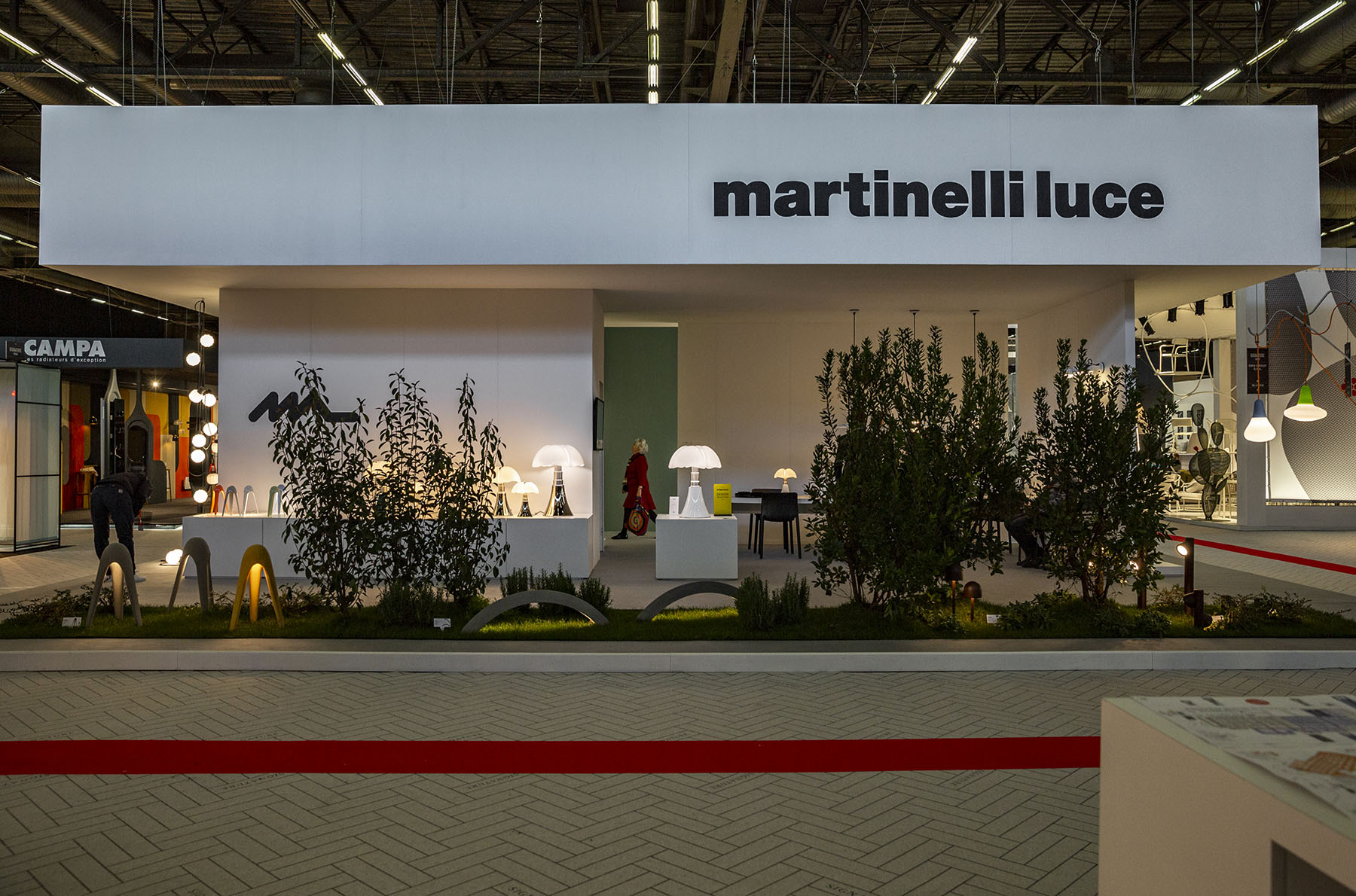 Martinelli Luce a également consacré un espace important du stand dédié aux lampes d'extérieur, notamment Pont de Marc Sadler, Bruco de Studio Natural, Cyborg de Karim Rashid, Boleto d'Emiliana Martinelli, Ciulifruli d'Alfonso Femia et Emiliana Martinelli et Kiki de Paola Navone.