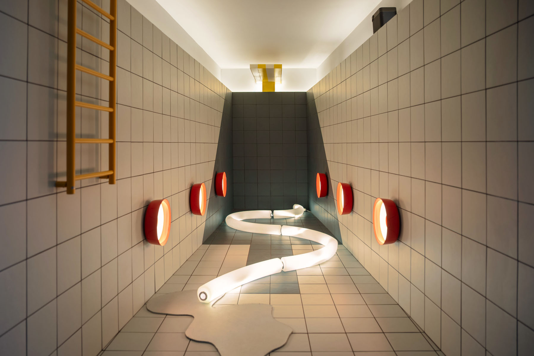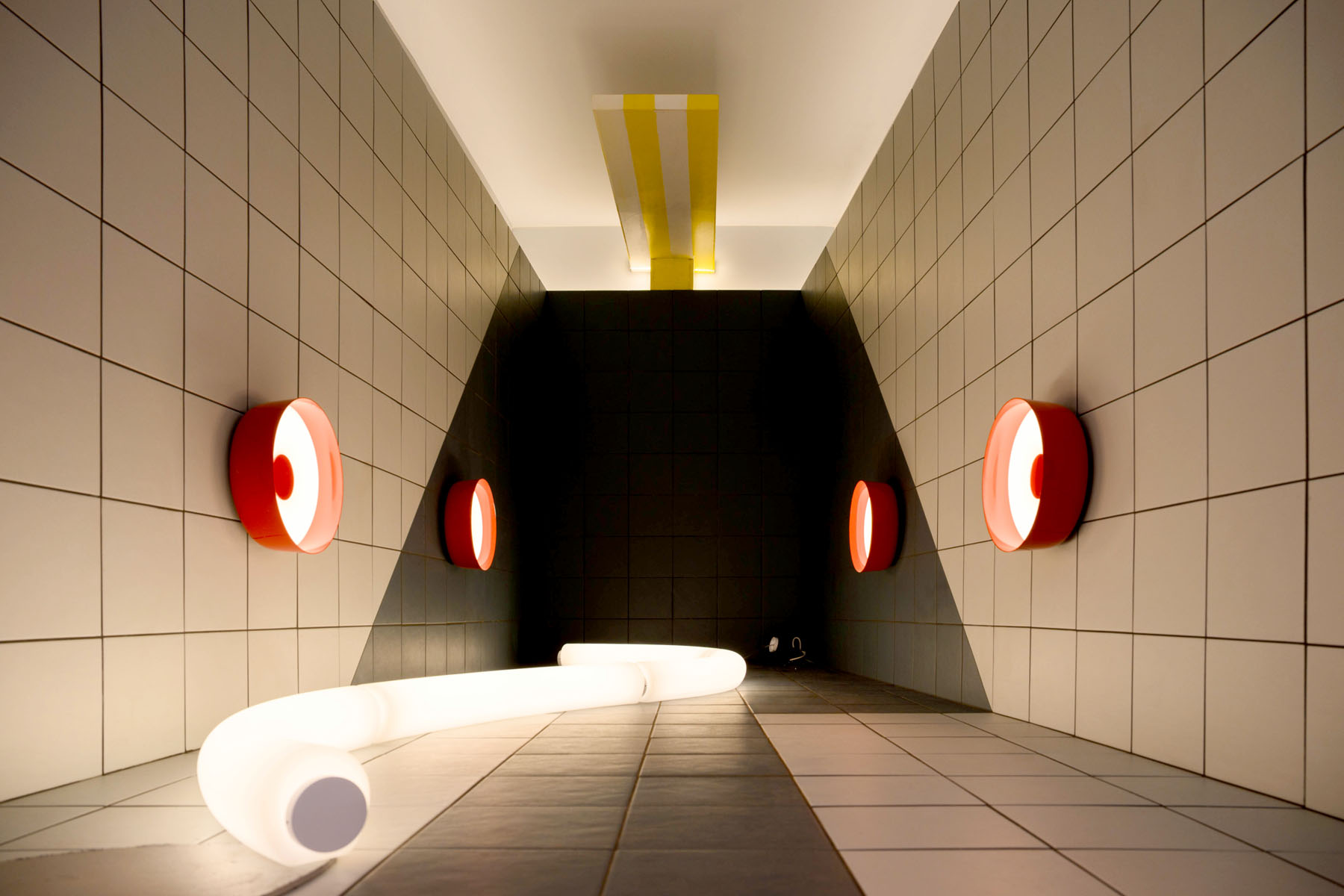 Per il progetto “Longing for Summer”, ideato e curato da studiodallerabonforte, le nostre lampade Mamba e Papavero illuminano una piscina immaginaria ricreata all’interno del container. Un ambiente sospeso tra sogno e memoria, dove i corpi illuminanti diventano parte della scenografia emotiva: Papavero, dal rosso vibrante, suggerisce il ritmo caldo dei pomeriggi assolati; Mamba, sinuosa e modulare, accompagna il visitatore come un segno grafico che attraversa lo spazio con dinamismo.