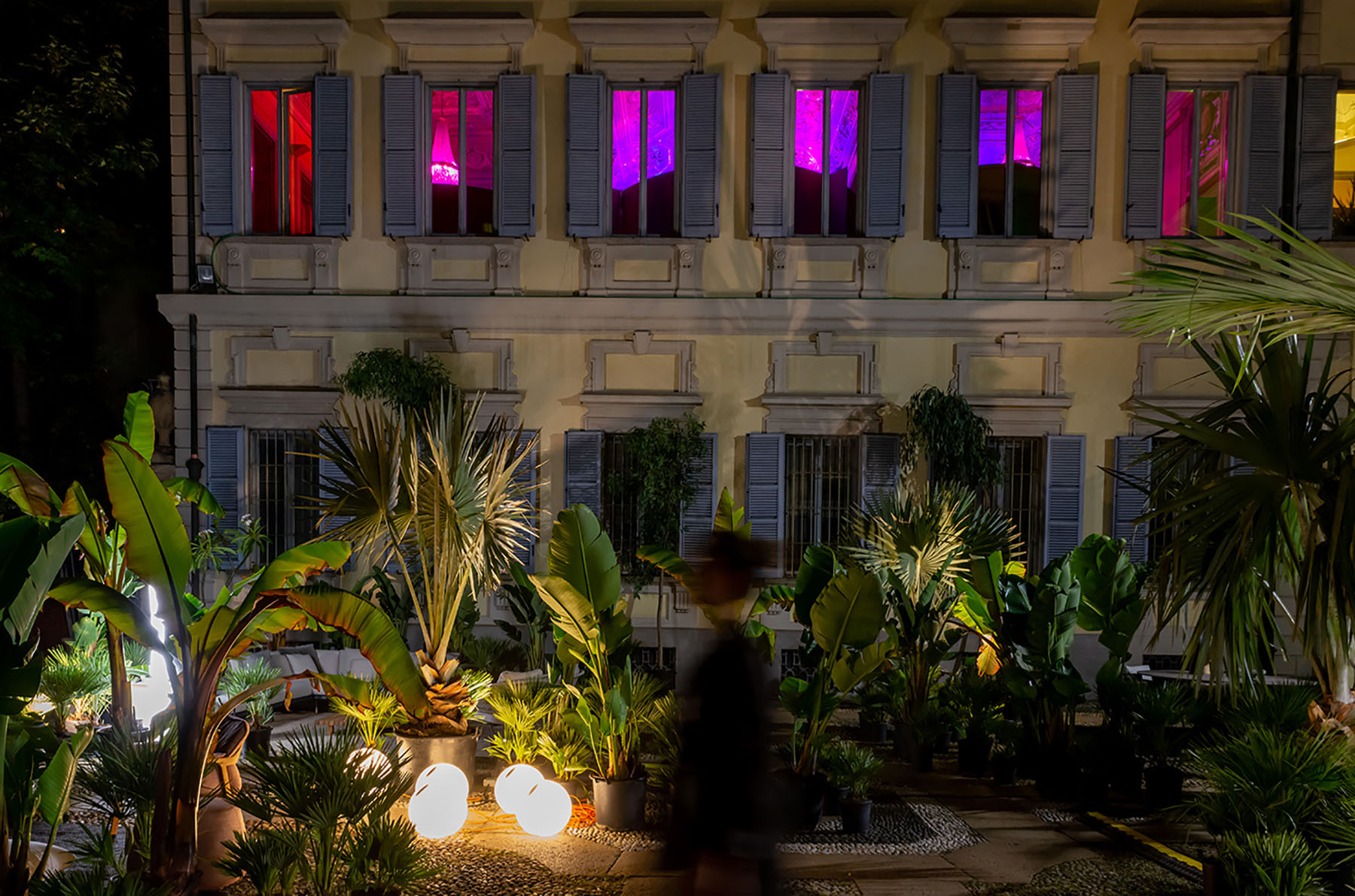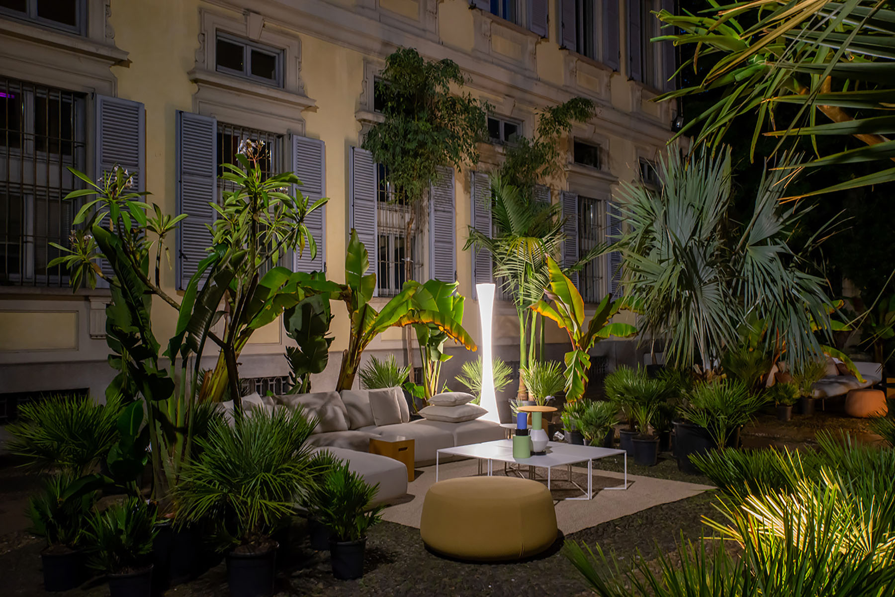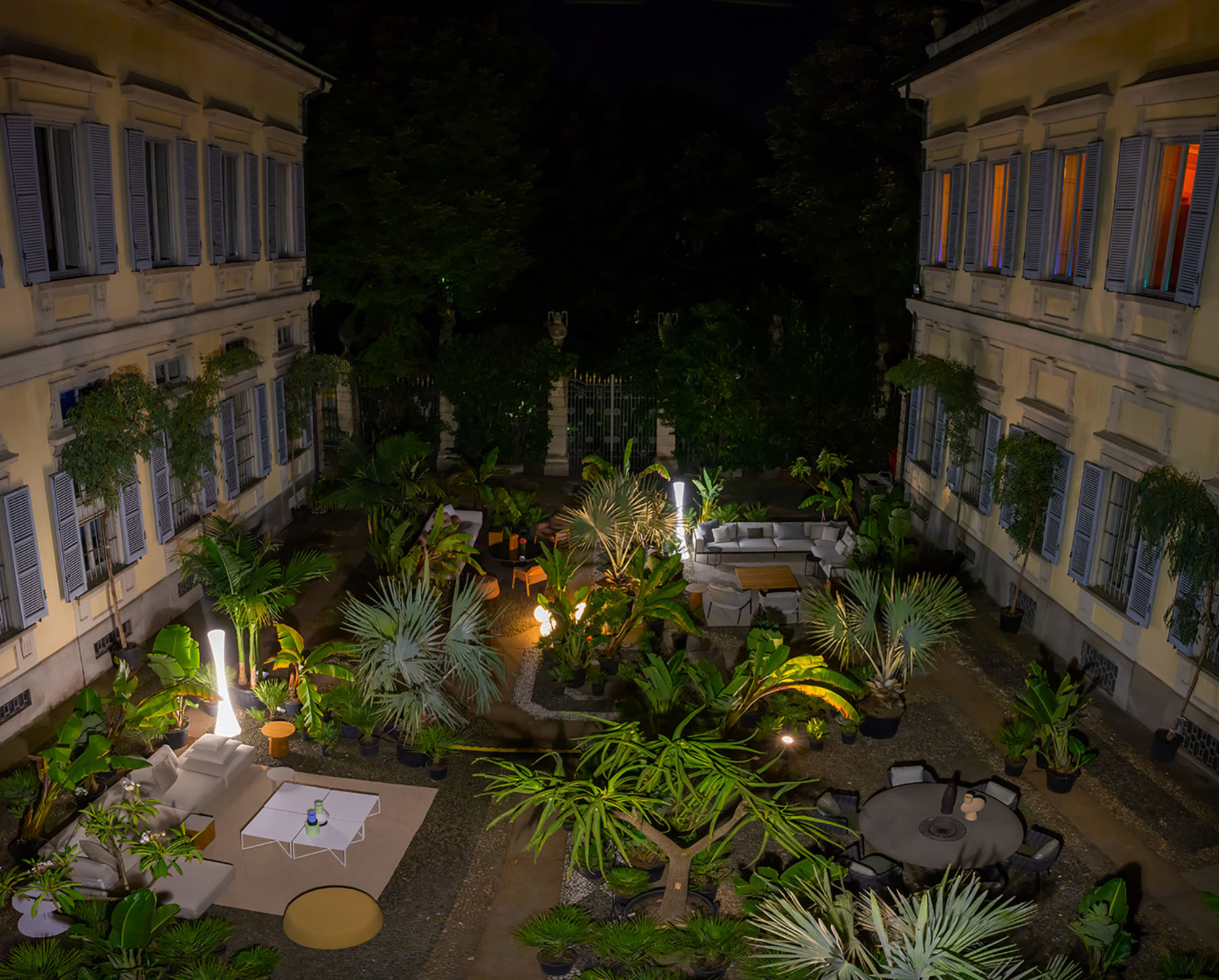 Le iconiche Ruspa e Elica disegnano con le loro forme - scultorea la prima, essenziale la seconda -, l'area "Room with a view" e infine le biconica pol e le bowl illuminano il giardino interno di Palazzo Bovara.
