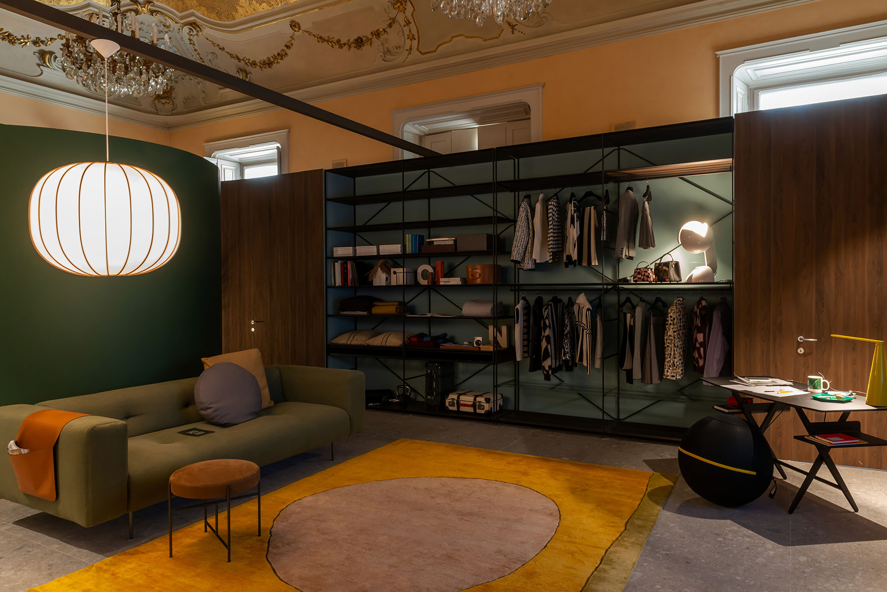 Due lampade elastica posizionate in parallelo accolgono i visitatori nella zona entrance di Palazzo Bovara, mentre elmetto, delux e calabrone a 3 spots animano i diversi angoli della flexible living area.